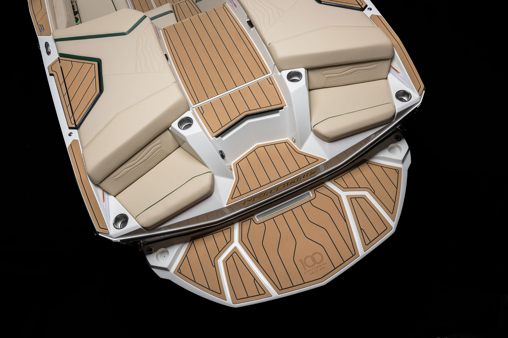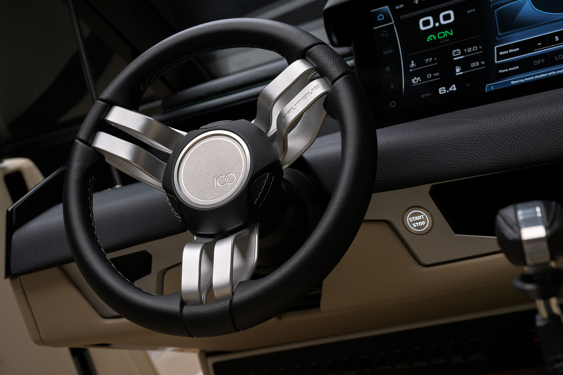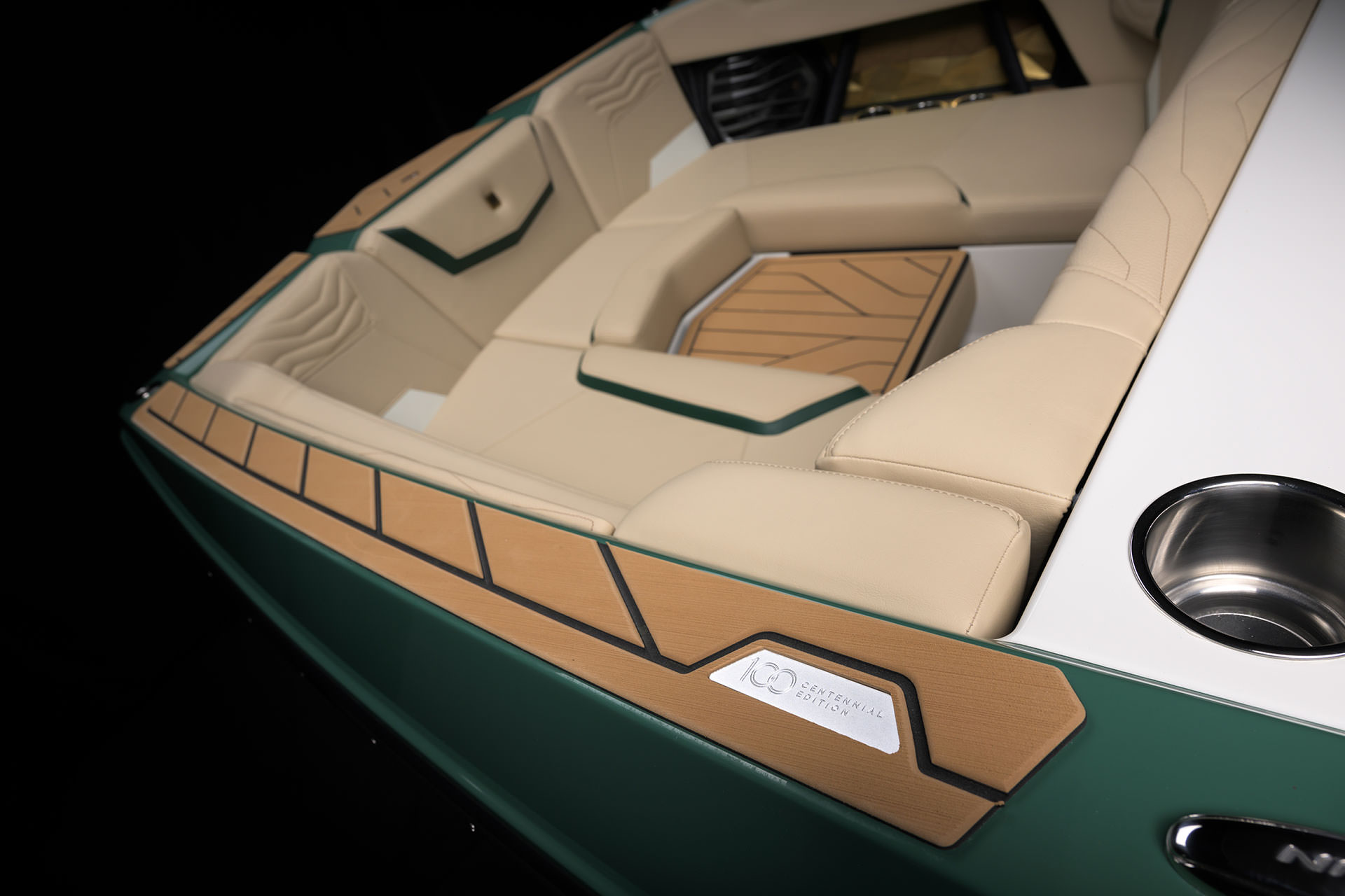 100周年を記念して、センテニアル エディションをご提供できることを誇りに思います。このエディションには、2025年モデルのすべてのボートに特別な装飾が加えられています。G23のドライバーズシートには、当社の代表的なセンテニアルロゴがステアリングホイールに刻まれており、ドライバーズシートの背面にはバッジとして表示されています。G23の電源を入れると、センテニアルロゴが LINCパノレイタッチスクリーンに表示されます。このロゴは、後部プラットフォームの SEADECKノンスキッドにレーザー刻印され、ガンネル上部のビレットプレートに機械刻印され、グローブ ボックスウィンドウの下側にレーザー刻印されています。2025年モデルのみで利用可能な限定ゲルコートカラー「センテニアル ブラック メタル フレーク」は、深みのあるオニキス ブラックとミディアム ゴールド フレークのユニークなブレンドで構成され、当社の 100 周年記念のエッセンスを表しています。