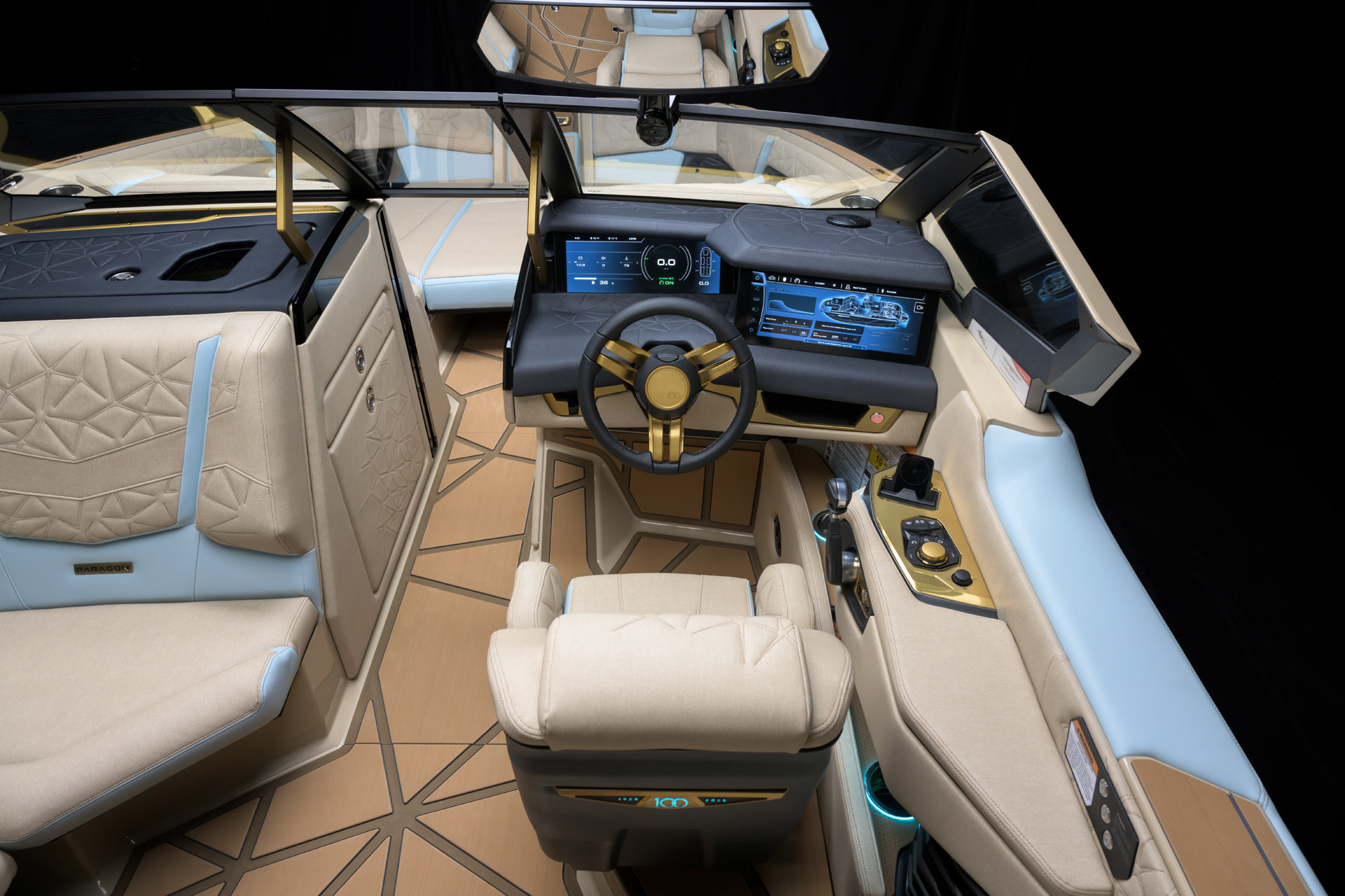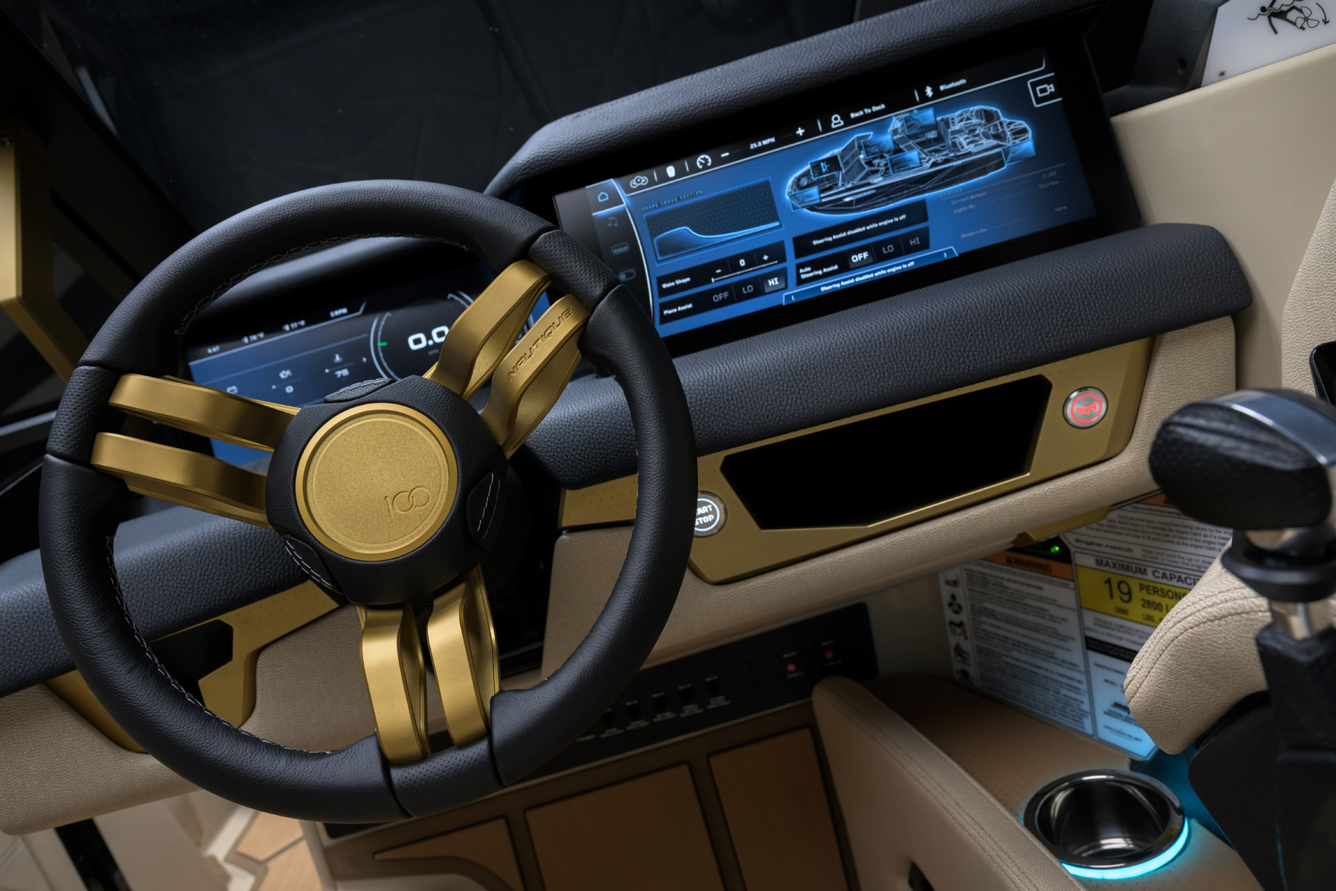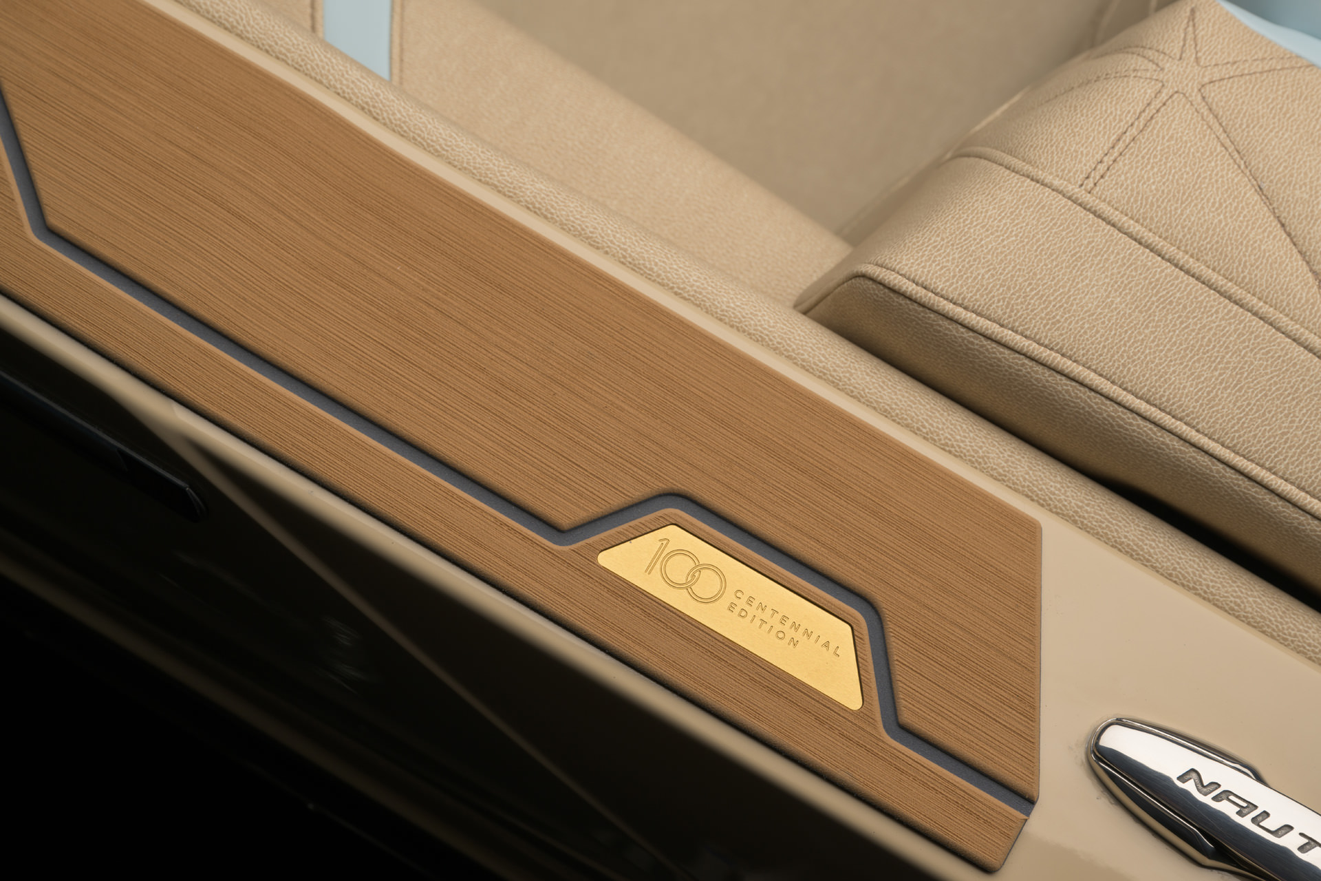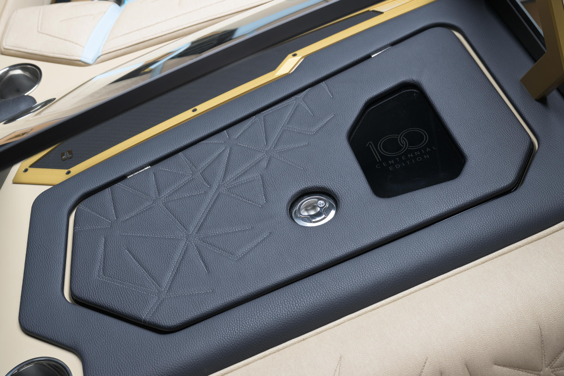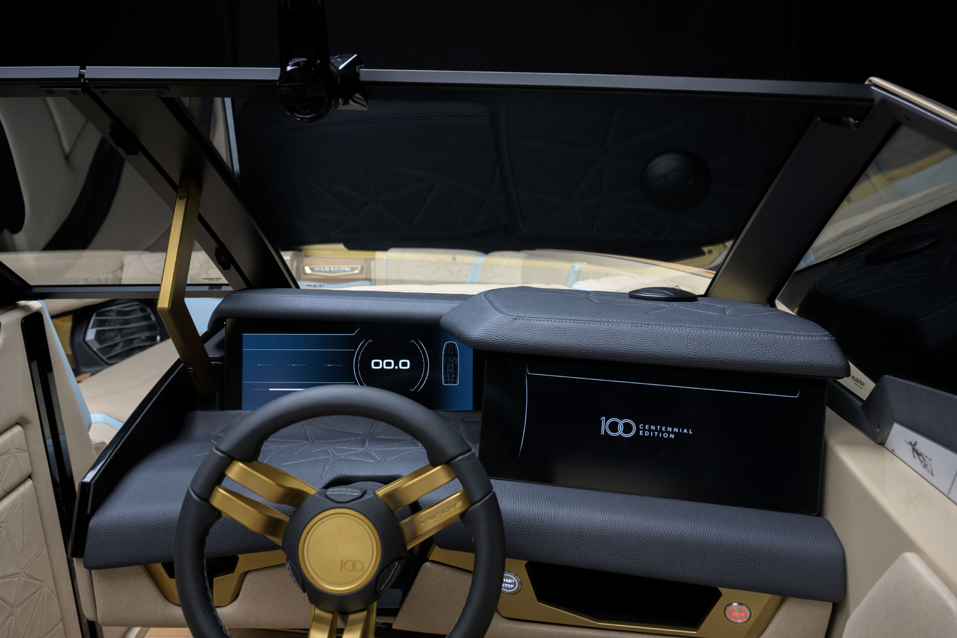 100周年を記念して、センテニアル エディションをご提供できることを誇りに思います。このエディションには、2025年モデルのすべてのボートに特別な装飾が加えられています。G25 PARAGONのドライバーズシートには、当社の代表的なセンテニアルロゴがステアリングホイールに刻まれており、ドライバーズシートの背面にはバッジとして表示されています。G25 PARAGONの電源を入れると、センテニアルロゴが LINCパノレイタッチスクリーンに表示されます。このロゴは、後部プラットフォームの SEADECKノンスキッドにレーザー刻印され、ガンネル上部のビレットプレートに機械刻印され、グローブ ボックスウィンドウの下側にレーザー刻印されています。PARAGONはこのモデル限定で、伸縮式フライト コントロール タワー® からの 100周年記念ロゴライトプロジェクションも含まれます。2025年モデルのみで利用可能な限定ゲルコートカラー「センテニアル ブラック メタル フレーク」は、深みのあるオニキス ブラックとミディアム ゴールド フレークのユニークなブレンドで構成され、当社の 100 周年記念のエッセンスを表しています。