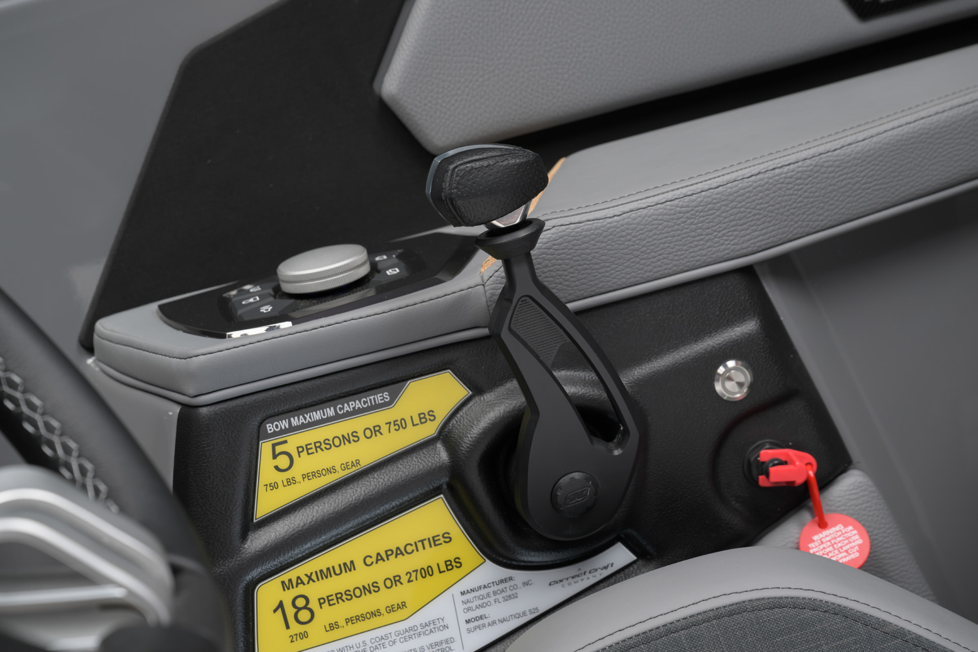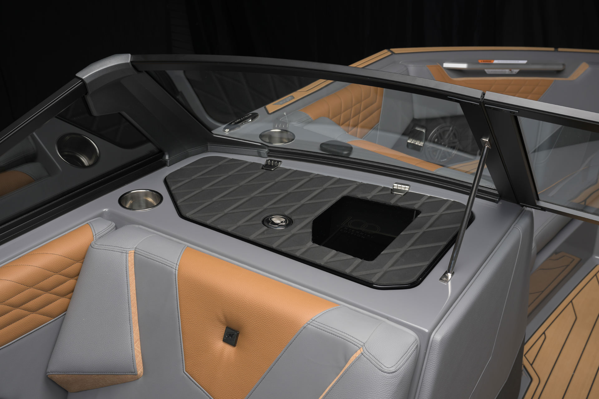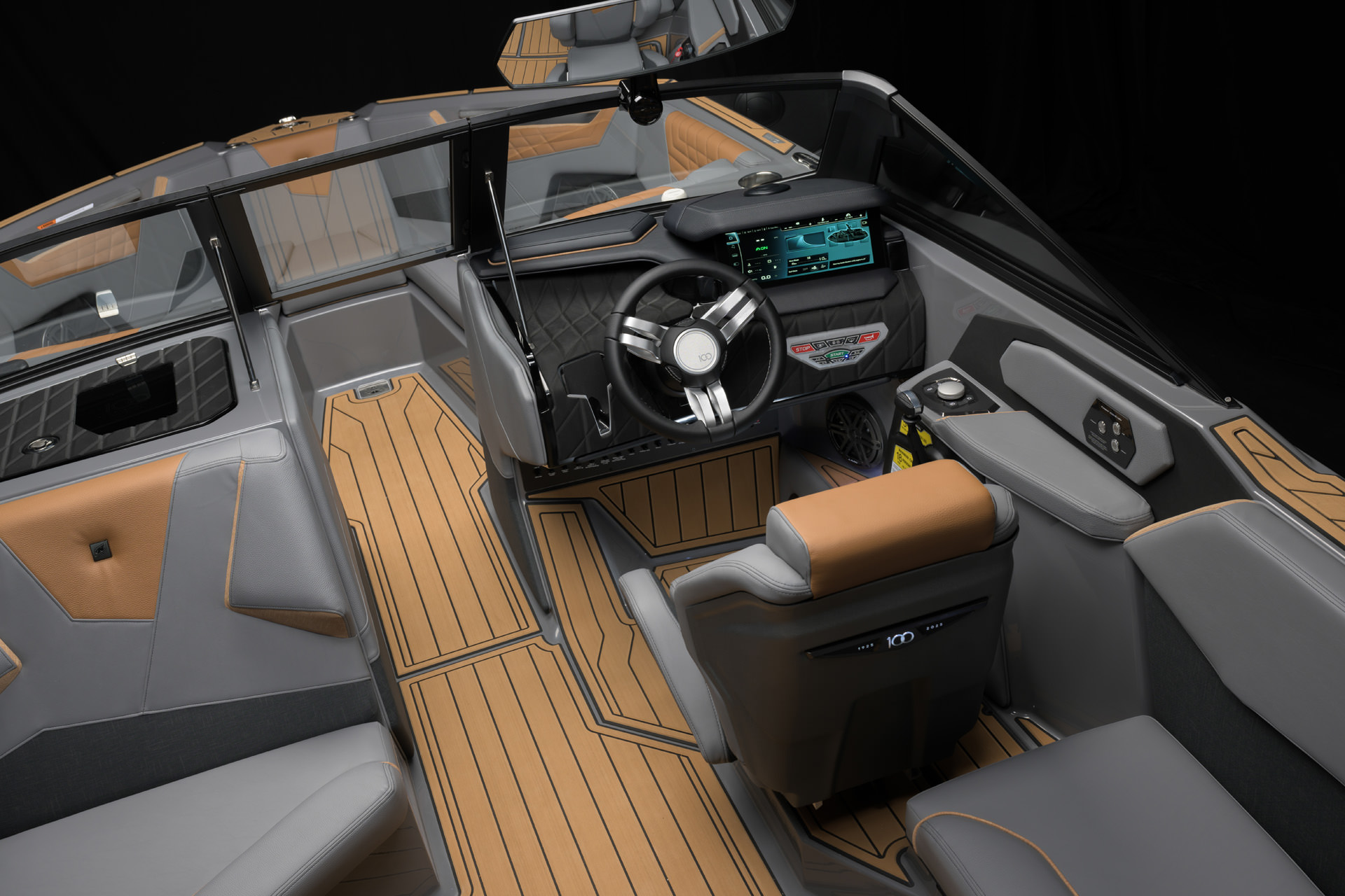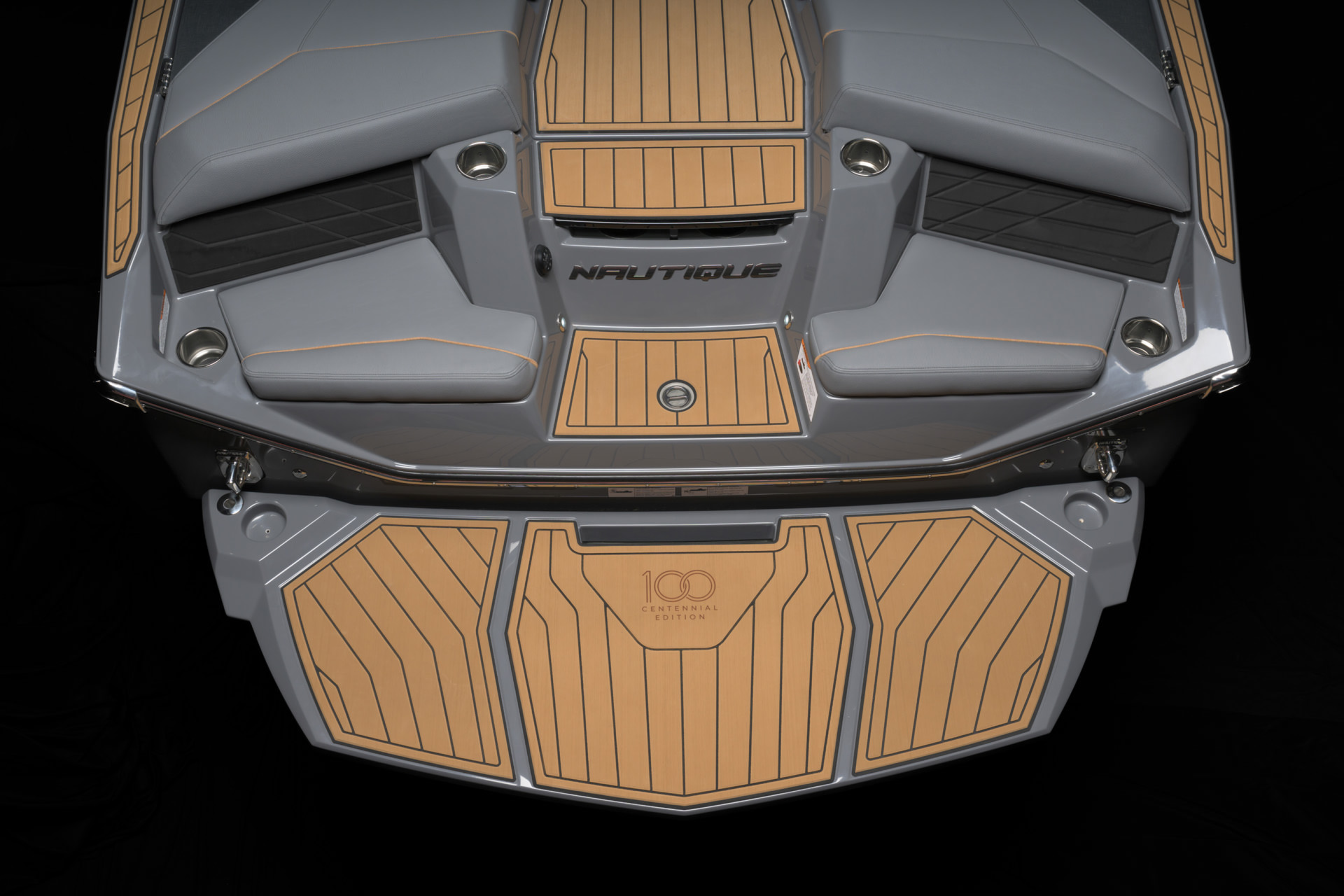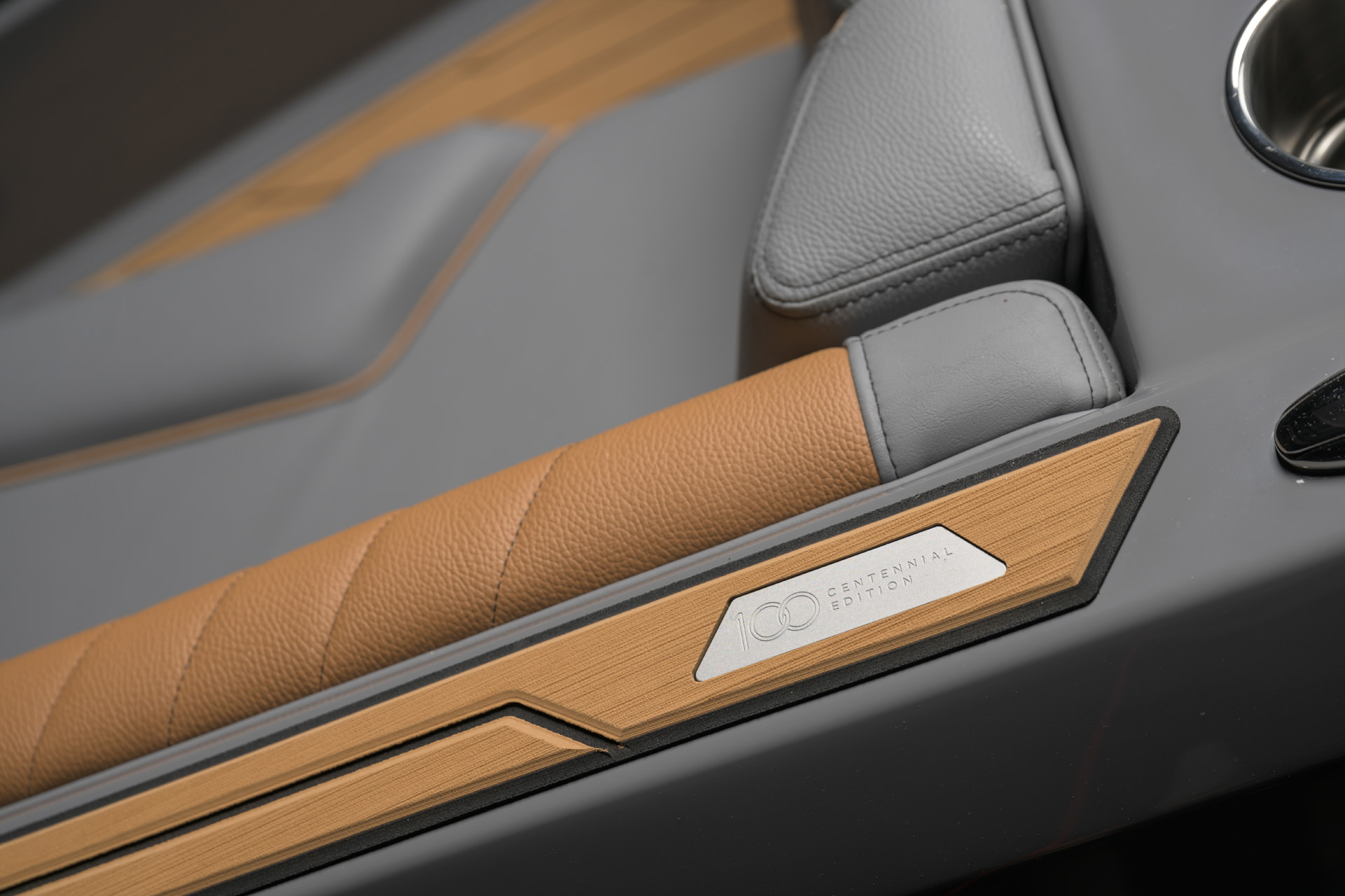 100周年を記念して、センテニアル エディションをご提供できることを誇りに思います。このエディションには、2025年モデルのすべてのボートに特別な装飾が加えられています。S25のドライバーズシートには、当社の代表的なセンテニアルロゴがステアリングホイールに刻まれており、ドライバーズシートの背面にはバッジとして表示されています。S25の電源を入れると、センテニアルロゴが LINCパノレイタッチスクリーンに表示されます。このロゴは、後部プラットフォームの SEADECKノンスキッドにレーザー刻印され、ガンネル上部のビレットプレートに機械刻印され、グローブ ボックスウィンドウの下側にレーザー刻印されています。2025年モデルのみで利用可能な限定ゲルコートカラー「センテニアル ブラック メタル フレーク」は、深みのあるオニキス ブラックとミディアム ゴールド フレークのユニークなブレンドで構成され、当社の 100 周年記念のエッセンスを表しています。