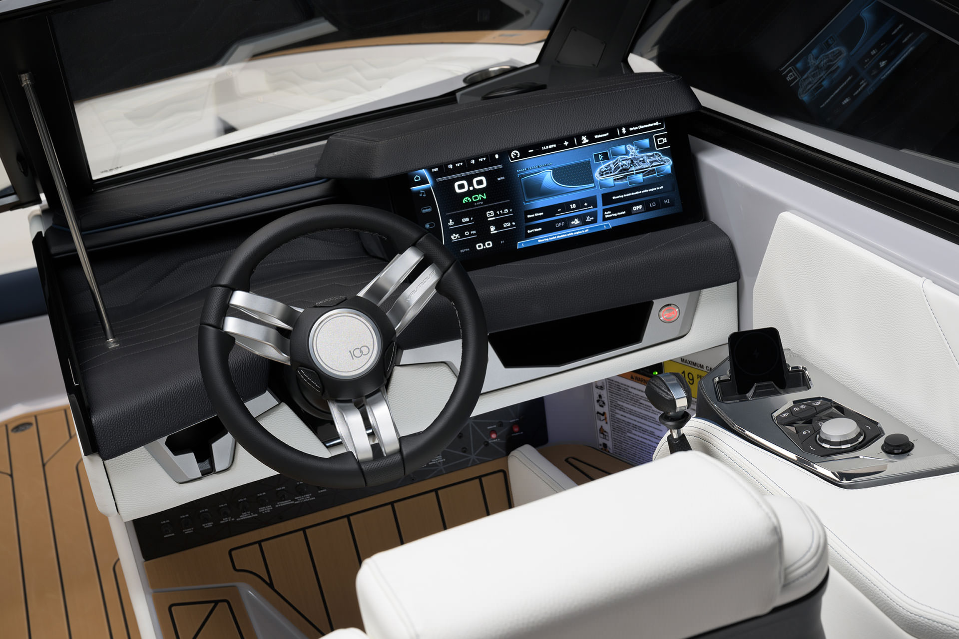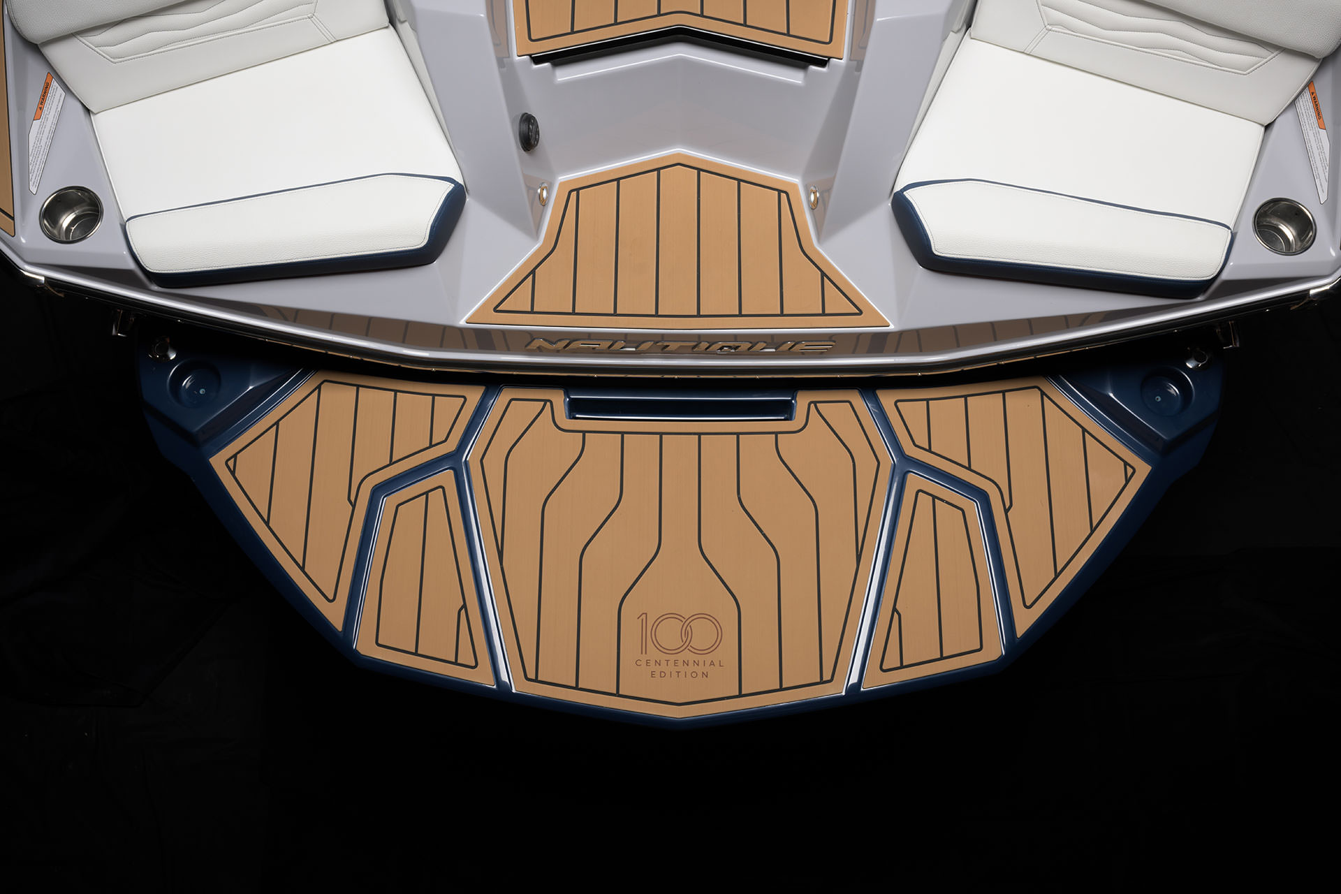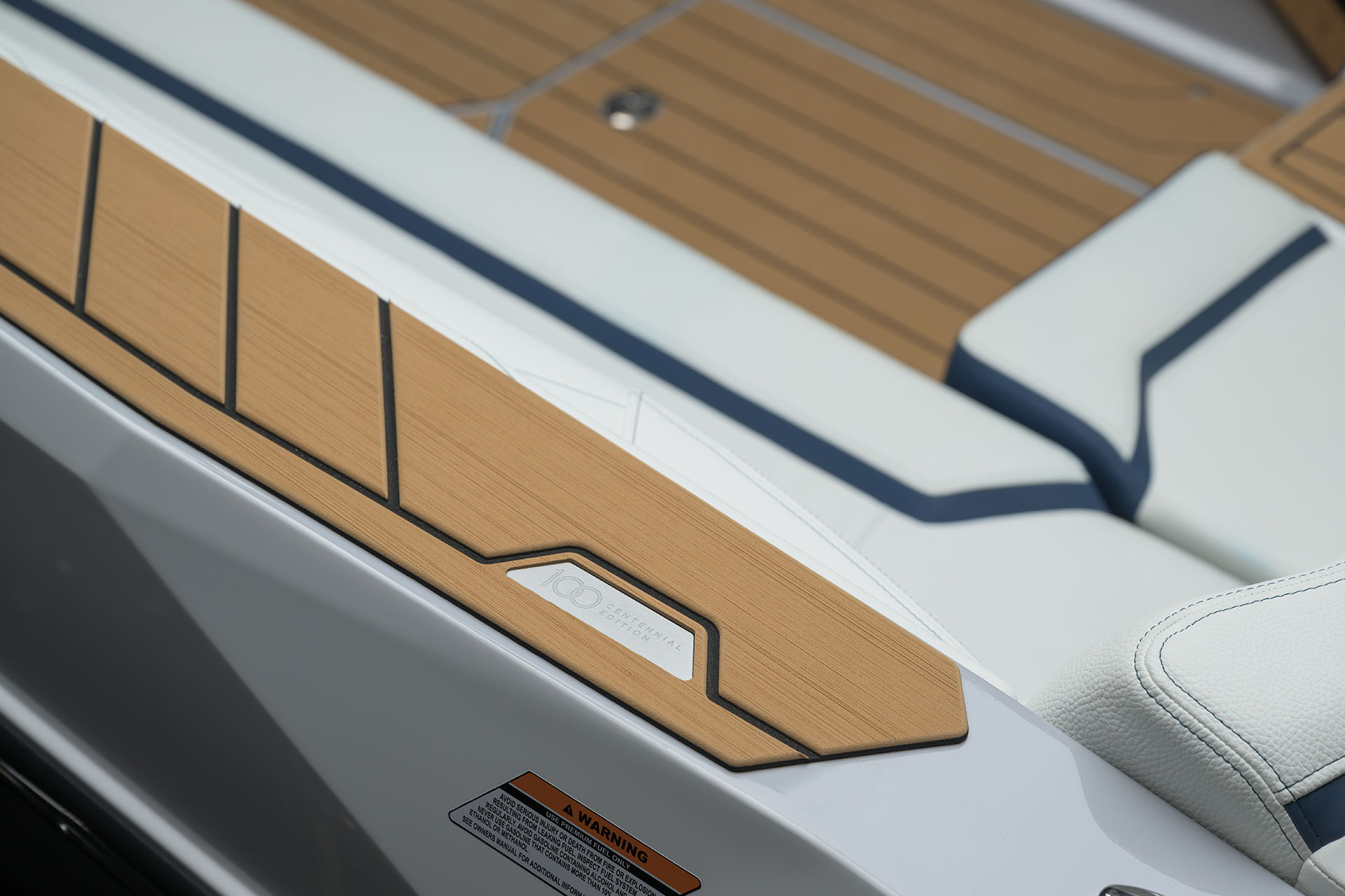 100周年を記念して、センテニアル エディションをご提供できることを誇りに思います。このエディションには、2025年モデルのすべてのボートに特別な装飾が加えられています。G25のドライバーズシートには、当社の代表的なセンテニアルロゴがステアリングホイールに刻まれており、ドライバーズシートの背面にはバッジとして表示されています。G25の電源を入れると、センテニアルロゴが LINCパノレイタッチスクリーンに表示されます。このロゴは、後部プラットフォームの SEADECKノンスキッドにレーザー刻印され、ガンネル上部のビレットプレートに機械刻印され、グローブ ボックスウィンドウの下側にレーザー刻印されています。2025年モデルのみで利用可能な限定ゲルコートカラー「センテニアル ブラック メタル フレーク」は、深みのあるオニキス ブラックとミディアム ゴールド フレークのユニークなブレンドで構成され、当社の 100 周年記念のエッセンスを表しています。