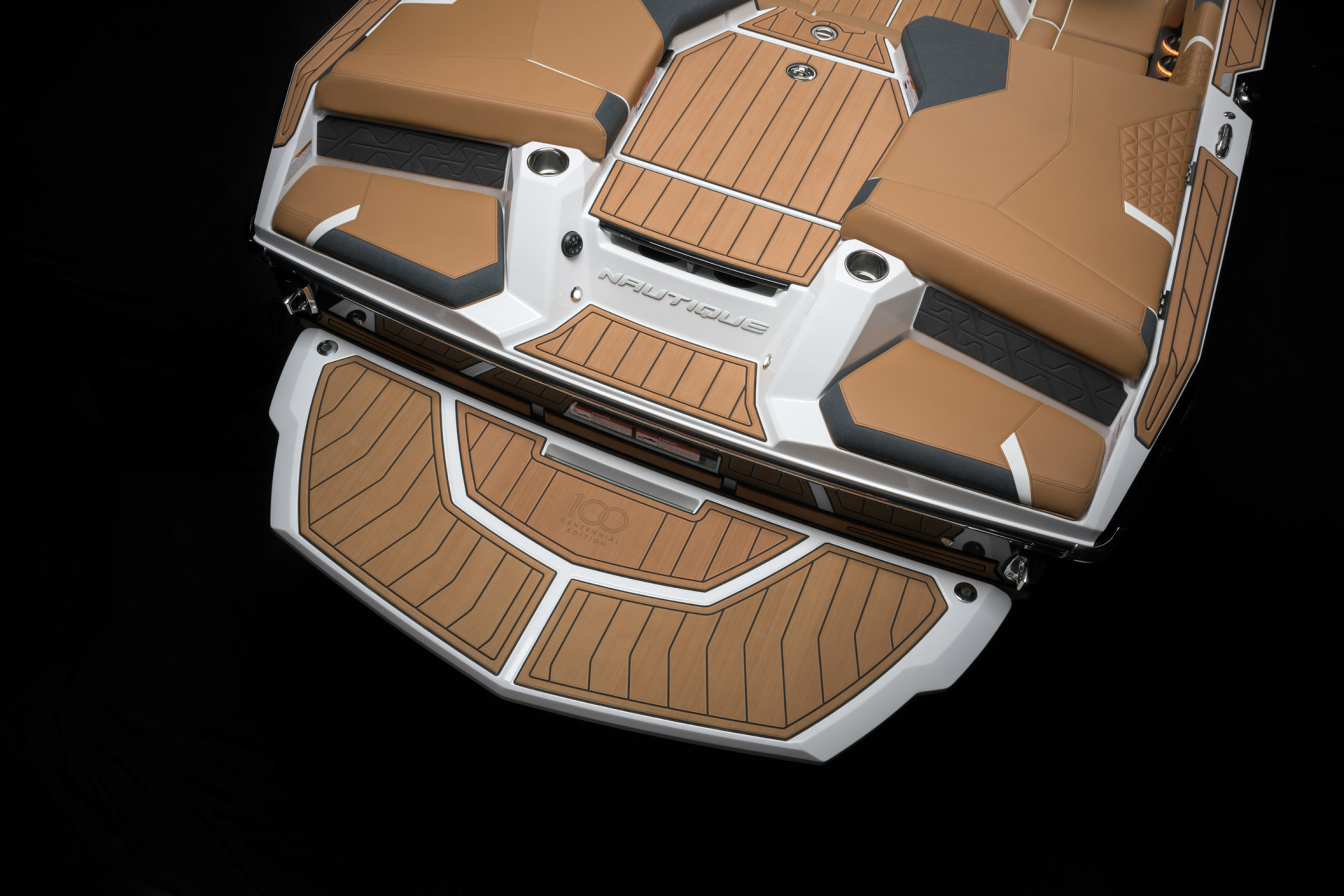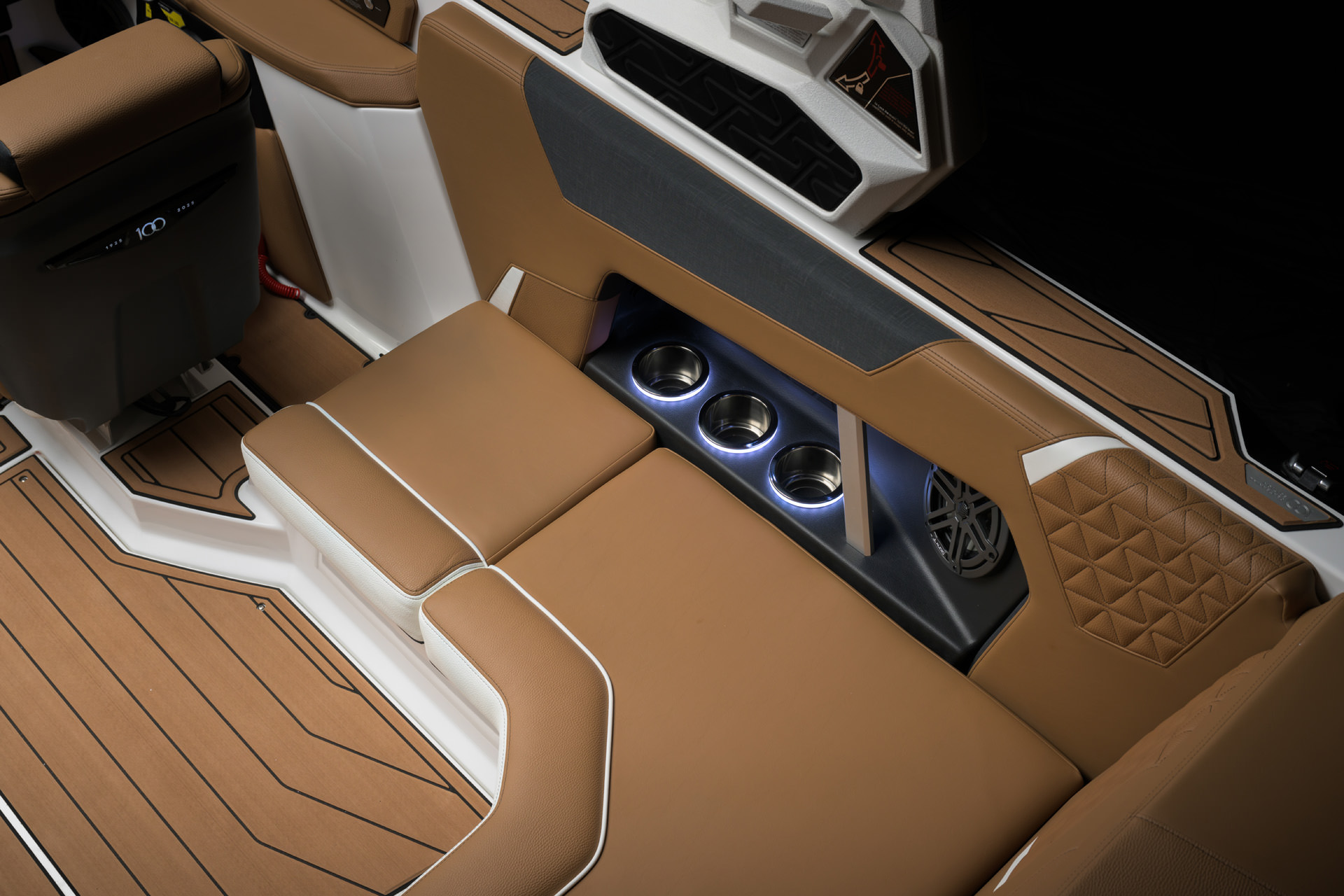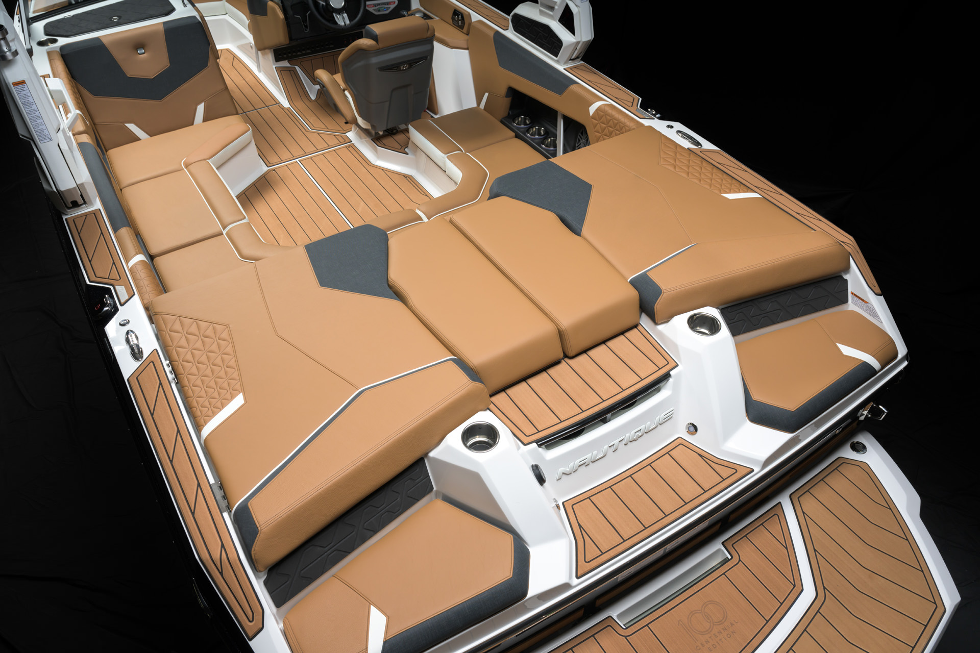 100周年を記念して、センテニアル エディションをご提供できることを誇りに思います。このエディションには、2025年モデルのすべてのボートに特別な装飾が加えられています。GS20のドライバーズシートには、当社の代表的なセンテニアルロゴがステアリングホイールに刻まれており、ドライバーズシートの背面にはバッジとして表示されています。GS20の電源を入れると、センテニアルロゴが LINCパノレイタッチスクリーンに表示されます。このロゴは、後部プラットフォームの SEADECKノンスキッドにレーザー刻印され、ガンネル上部のビレットプレートに機械刻印され、グローブ ボックスウィンドウの下側にレーザー刻印されています。2025年モデルのみで利用可能な限定ゲルコートカラー「センテニアル ブラック メタル フレーク」は、深みのあるオニキス ブラックとミディアム ゴールド フレークのユニークなブレンドで構成され、当社の 100 周年記念のエッセンスを表しています。