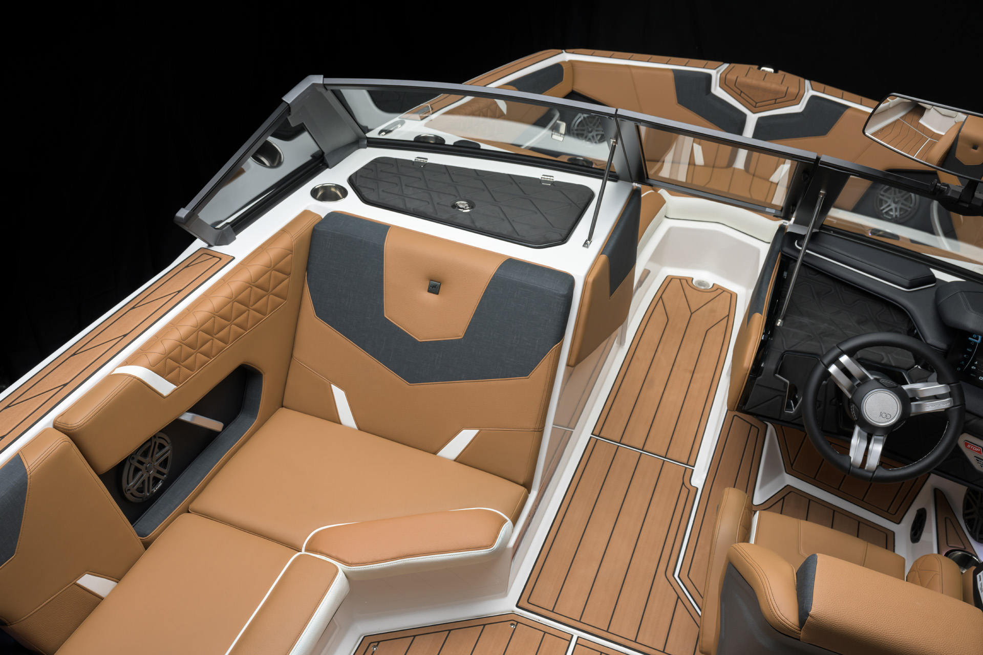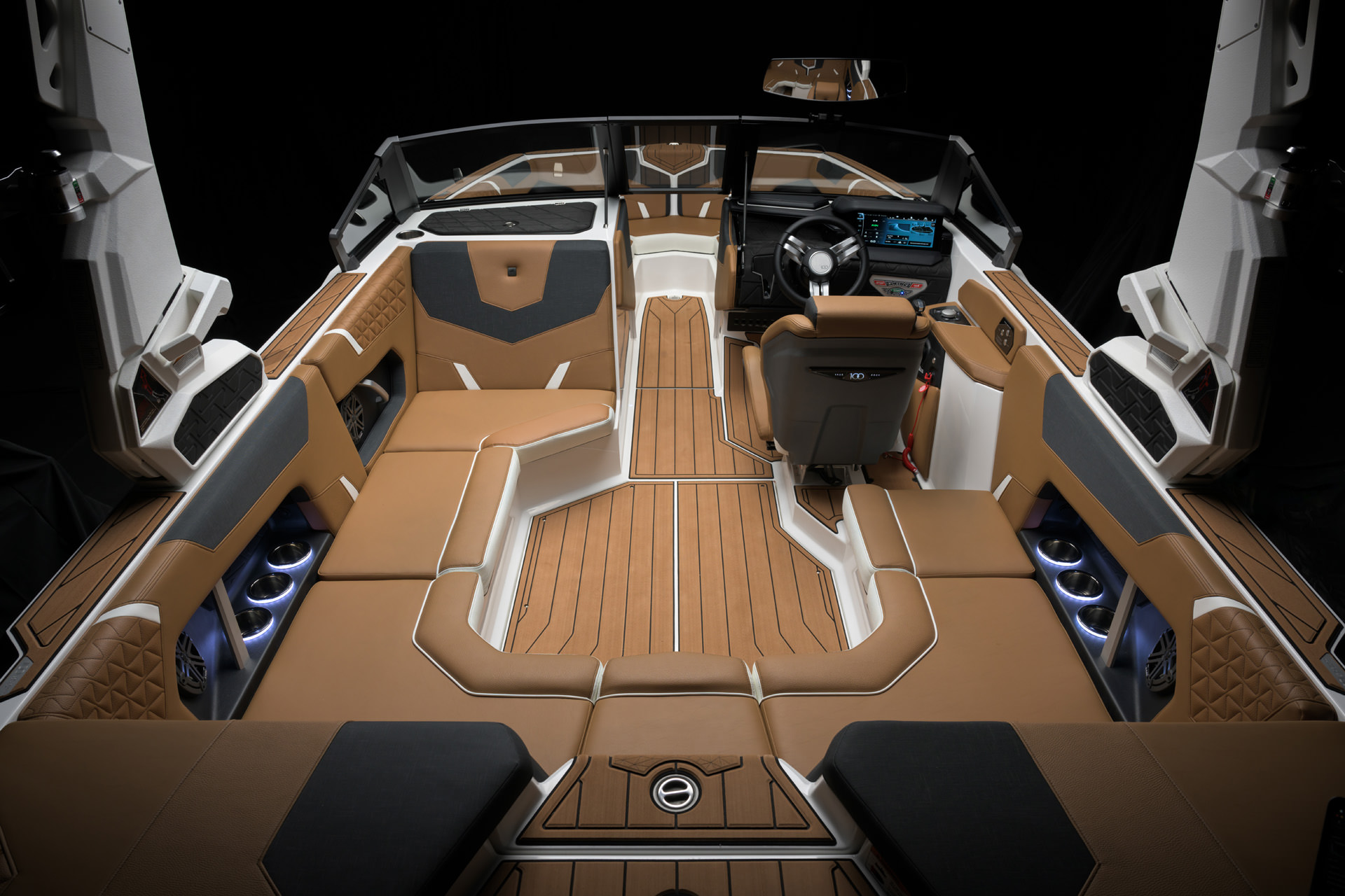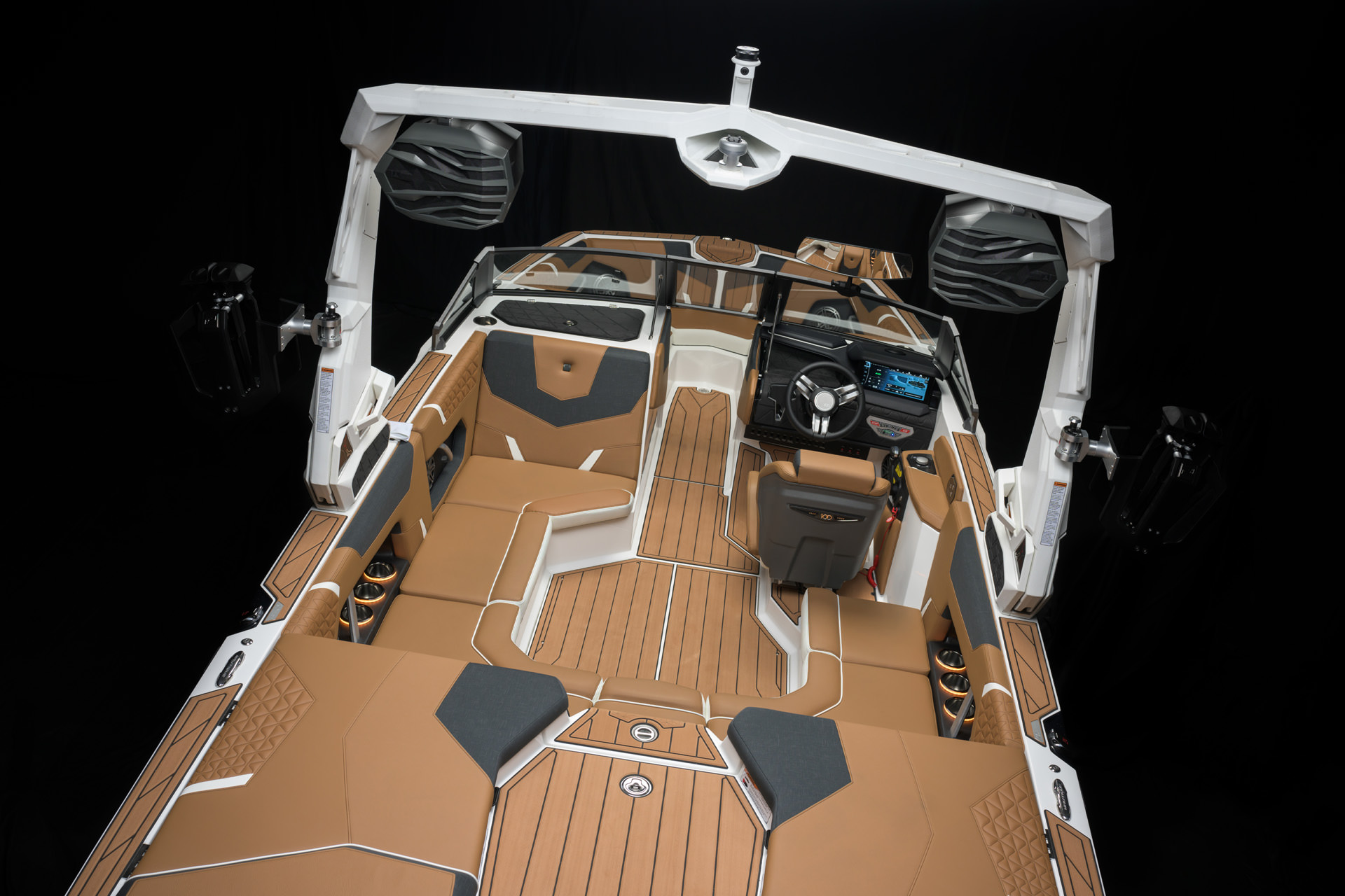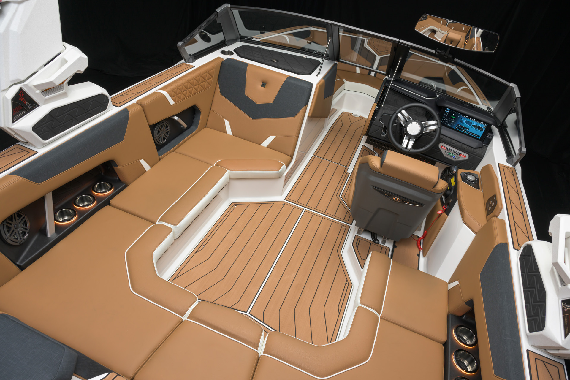 100周年を記念して、センテニアル エディションをご提供できることを誇りに思います。このエディションには、2025年モデルのすべてのボートに特別な装飾が加えられています。GS20のドライバーズシートには、当社の代表的なセンテニアルロゴがステアリングホイールに刻まれており、ドライバーズシートの背面にはバッジとして表示されています。GS20の電源を入れると、センテニアルロゴが LINCパノレイタッチスクリーンに表示されます。このロゴは、後部プラットフォームの SEADECKノンスキッドにレーザー刻印され、ガンネル上部のビレットプレートに機械刻印され、グローブ ボックスウィンドウの下側にレーザー刻印されています。2025年モデルのみで利用可能な限定ゲルコートカラー「センテニアル ブラック メタル フレーク」は、深みのあるオニキス ブラックとミディアム ゴールド フレークのユニークなブレンドで構成され、当社の 100 周年記念のエッセンスを表しています。